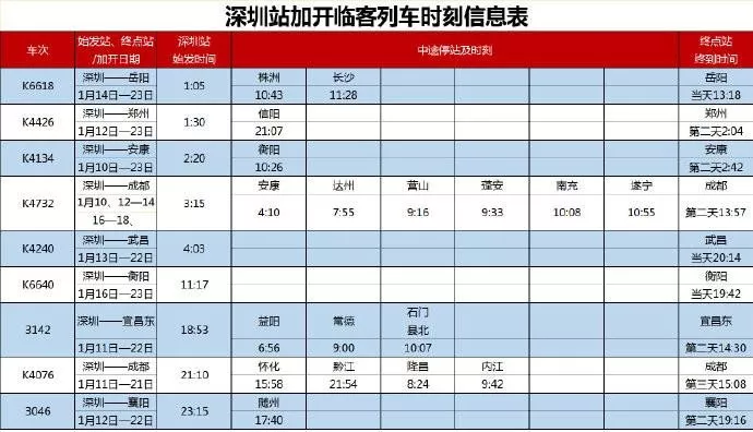 為了迎接春運,深圳火車站調(diào)整了列車開行,將加開多趟臨客。目前,深圳往返肇慶的C7090/89次跨線動車組列車暫未開行,深圳東往返懷化的K9052/1次列車已經(jīng)停運。今天(1月8日)起,深圳往返河源的Z8006/5次將停運。春運期間,深圳往返梅州的T8370/69次列車將改為在深圳至大埔間開行。