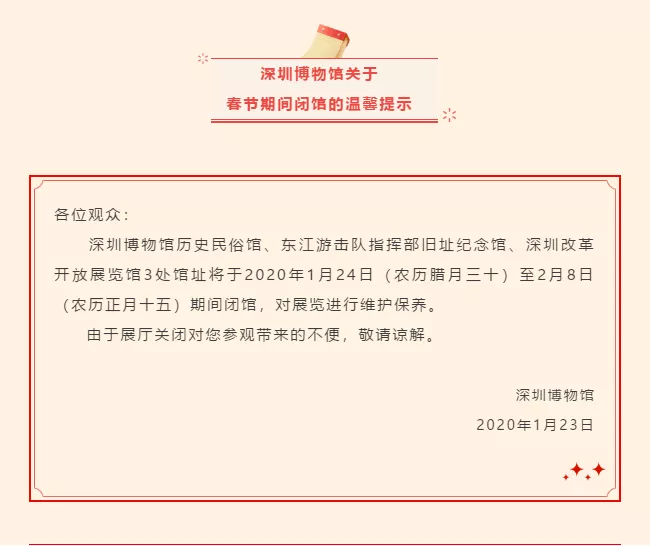 深圳博物館歷史民俗館、東江游擊隊指揮部舊址紀念館、深圳改革開放展覽館3處館址將于2020年1月24日(農歷臘月三十)至2月8日(農歷正月十五)期間閉館,對展覽進行維護保養(yǎng)。由于展廳關閉對您參觀帶來的不便,敬請諒解。