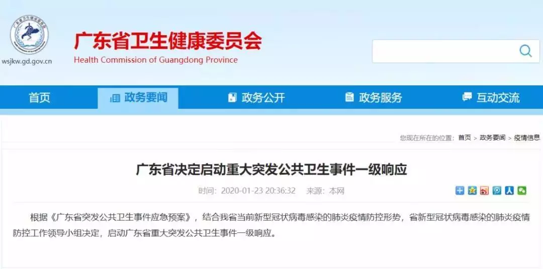 廣東省衛(wèi)健委1月23日晚發(fā)布通告:根據(jù)《廣東省突發(fā)公共衛(wèi)生事件應急預案》,結合我省當前新型冠狀病毒感染的肺炎疫情防控形勢,省新型冠狀病毒感染的肺炎疫情防控工作領導小組決定,啟動廣東省重大突發(fā)公共衛(wèi)生事件一級響應。