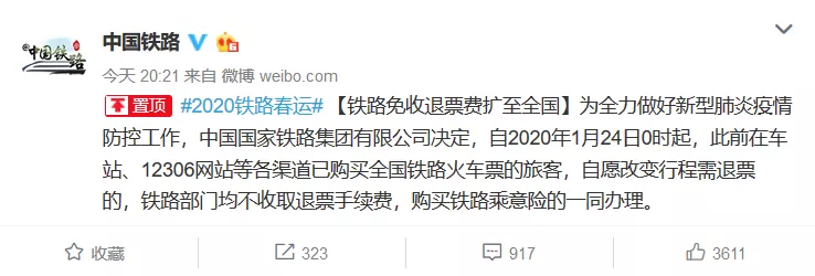 【鐵路免收退票費擴至全國】為全力做好新型肺炎疫情防控工作,中國國家鐵路集團有限公司決定,自2020年1月24日0時起,此前在車站、12306網站等各渠道已購買全國鐵路火車票的旅客,自愿改變行程需退票的,鐵路部門均不收取退票手續(xù)費,購買鐵路乘意險的一同辦理。
