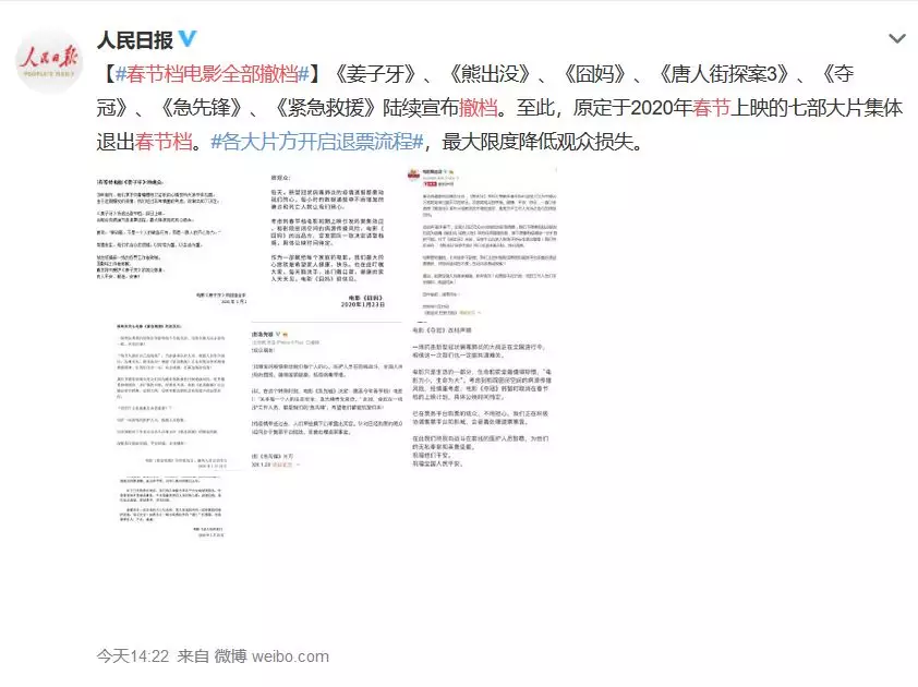 因“擔憂疫情進一步擴散”、“考慮影院密閉空間的病源傳播風險”等因素,23日,2020春節(jié)檔的七部影片《唐人街探案3》《囧媽》《奪冠》《緊急救援》《姜子牙》《熊出沒·狂野大陸》《急先鋒》集體宣布撤檔,均將擇日再映。各大片方開啟退票流程,最大限度降低觀眾損失。