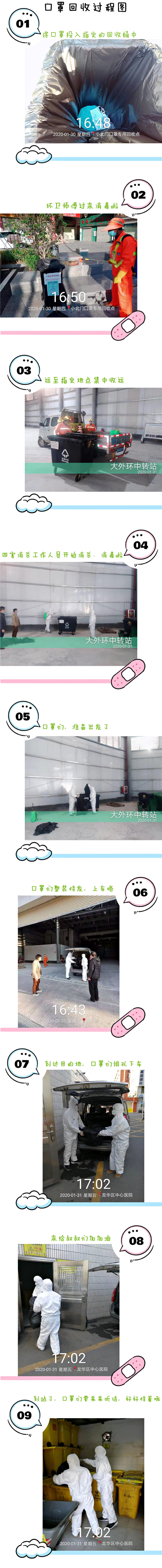 據(jù)了解,廢棄口罩每天由環(huán)衛(wèi)服務(wù)公司定時(shí)收集運(yùn)送至街道回收站,再由消殺公司工作人員著防護(hù)服現(xiàn)場(chǎng)消毒后統(tǒng)一運(yùn)送到龍華區(qū)中心醫(yī)院進(jìn)行統(tǒng)一專業(yè)化銷毀處理(詳細(xì)流程見下圖)。整個(gè)處理流程福城街道市政管理服務(wù)中心嚴(yán)格把控,每天安排專人進(jìn)行現(xiàn)場(chǎng)督促處理,堅(jiān)決防止廢棄口罩因處理不當(dāng)引起的二次污染。