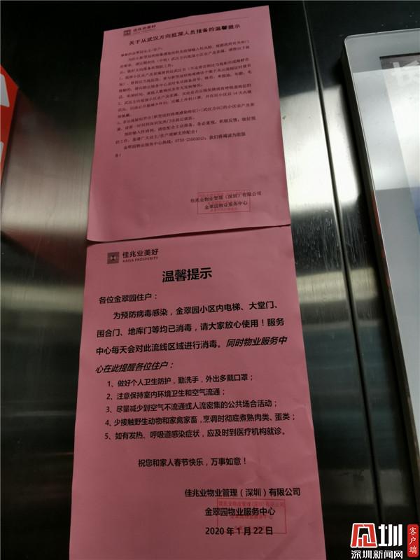 小區(qū)物業(yè)管理處主任鄒菊彬表示,目前小區(qū)每天進(jìn)行3次全面消殺,包括地面、電梯、樓道等多個位置。他表示,小區(qū)內(nèi)已張貼《新型冠狀病毒感染的肺炎相關(guān)知識和個人防護(hù)》等防護(hù)指引和宣傳資料。物業(yè)工作人員向還未返深的住戶進(jìn)行了宣傳解釋,消除恐慌。對返深的小區(qū)住戶已做好詳細(xì)信息登記,對居家醫(yī)學(xué)觀察的住戶每天兩次隨訪,并經(jīng)常給他們送一些生活用品?!拔覀兊墓ぷ魅藛T已經(jīng)把電話留給他們,有啥需要幫忙的可以隨時聯(lián)系”,他說到。