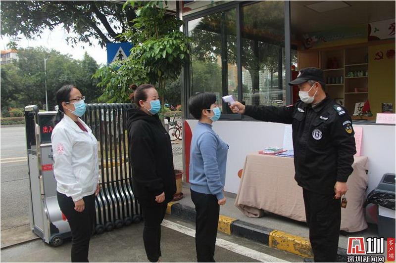 上午8點(diǎn)30分,海樂社區(qū)黨群服務(wù)中心社區(qū)工作站的保安正為義工測量體溫。
