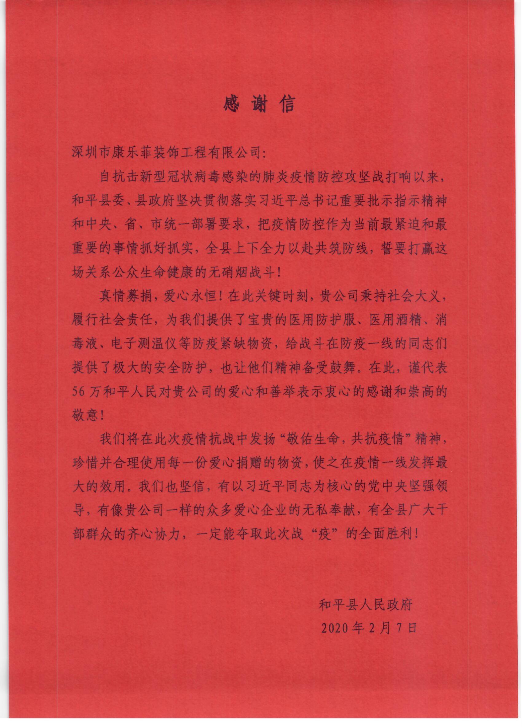 和平縣人民政府向愛(ài)心企業(yè)送上的感謝信