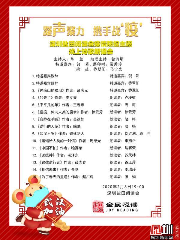 見(jiàn)圳客戶端?深圳新聞網(wǎng)訊(記者 潘峰 通訊員 徐云芳)近日,全民悅讀深圳鹽田閱讀會(huì)舉行了一場(chǎng)“凝聲聚力,攜手戰(zhàn)疫”抗擊疫情線上主題朗誦會(huì),為打贏防控疫情阻擊戰(zhàn)加油鼓勁。