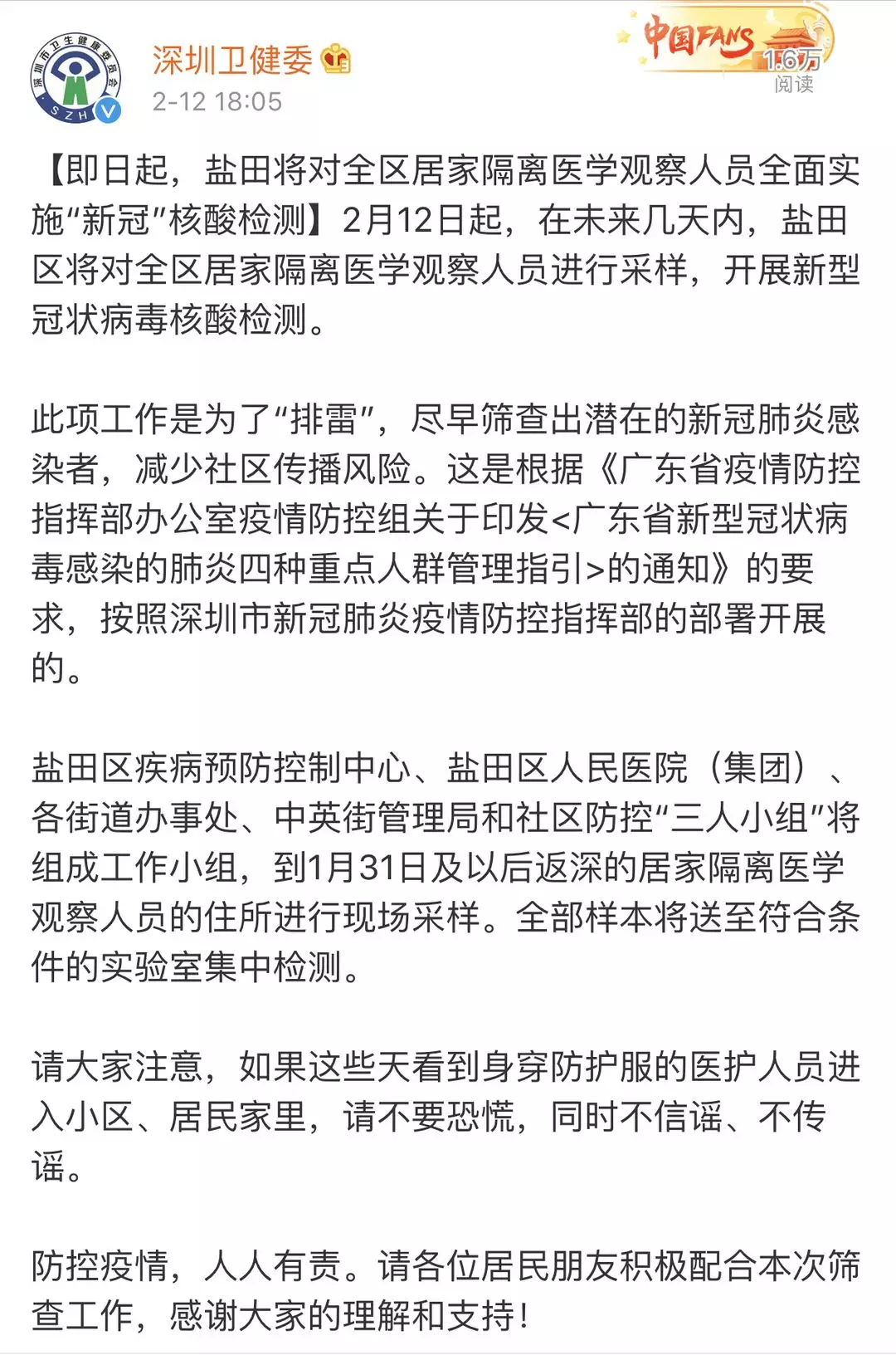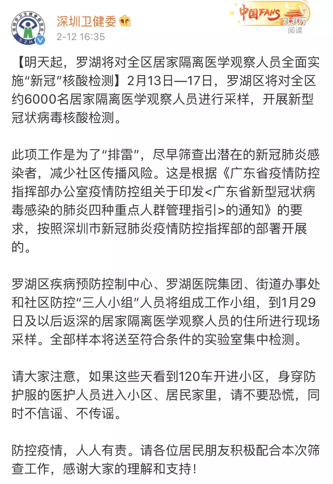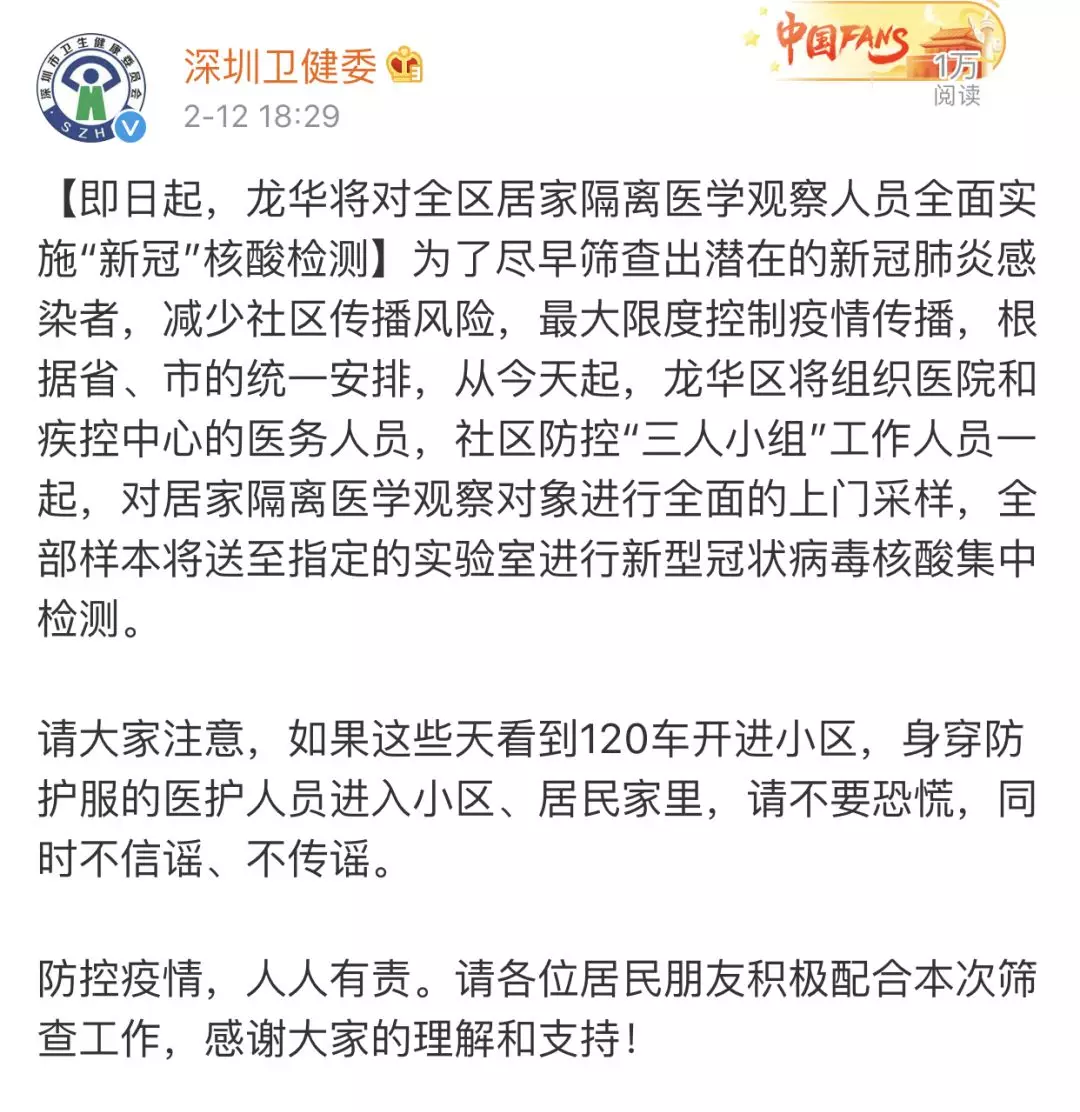 為防范新冠病毒感染疫情的社區(qū)傳播,切實做到早發(fā)現(xiàn)、早隔離、早診斷、早治療,2月12日起,深圳各區(qū)(新區(qū))均為所有居家隔離醫(yī)學觀察人員檢測新型冠狀病毒核酸。