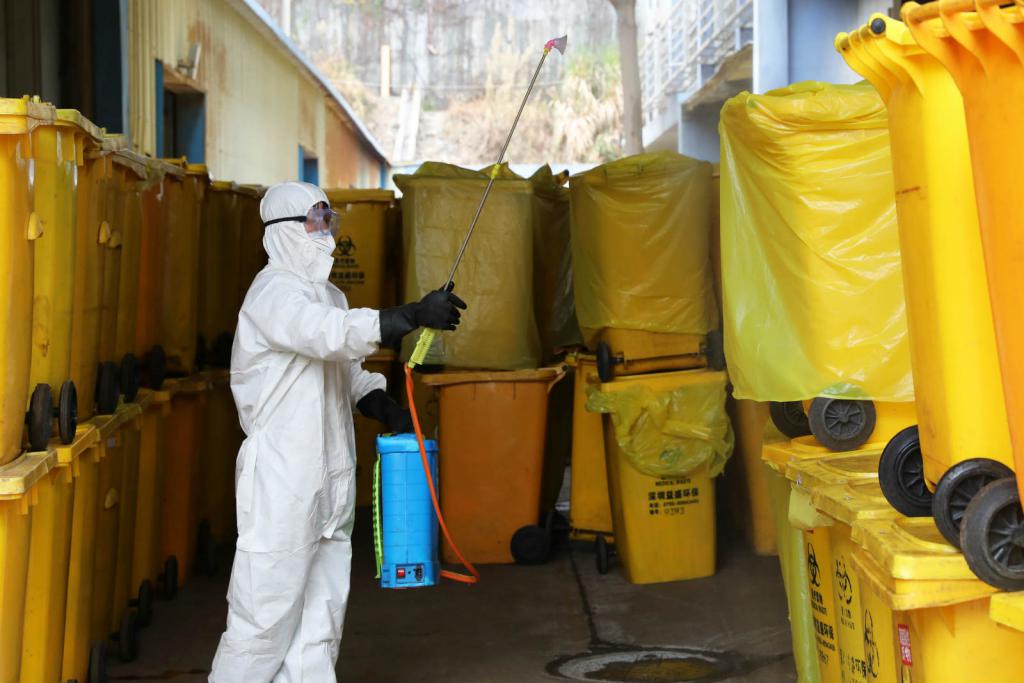 ▲卸完醫(yī)療廢物后,工作人員對(duì)堆放區(qū)域進(jìn)行消毒。