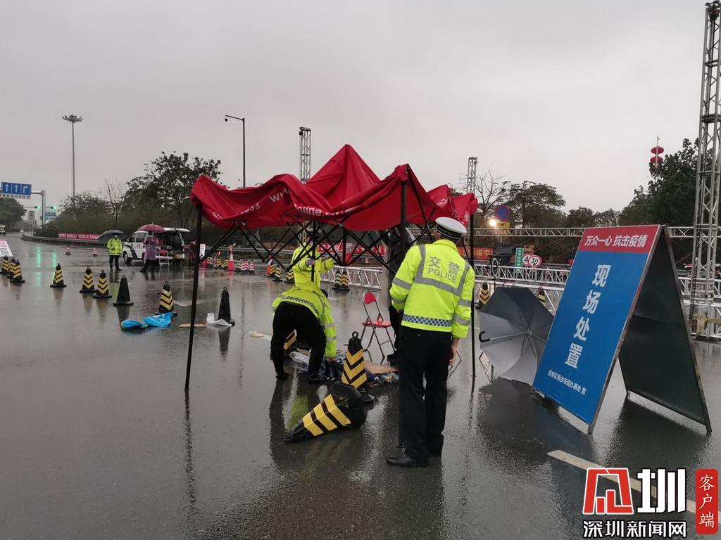暴雨來臨,深圳交警民警在檢疫點安裝雨棚。