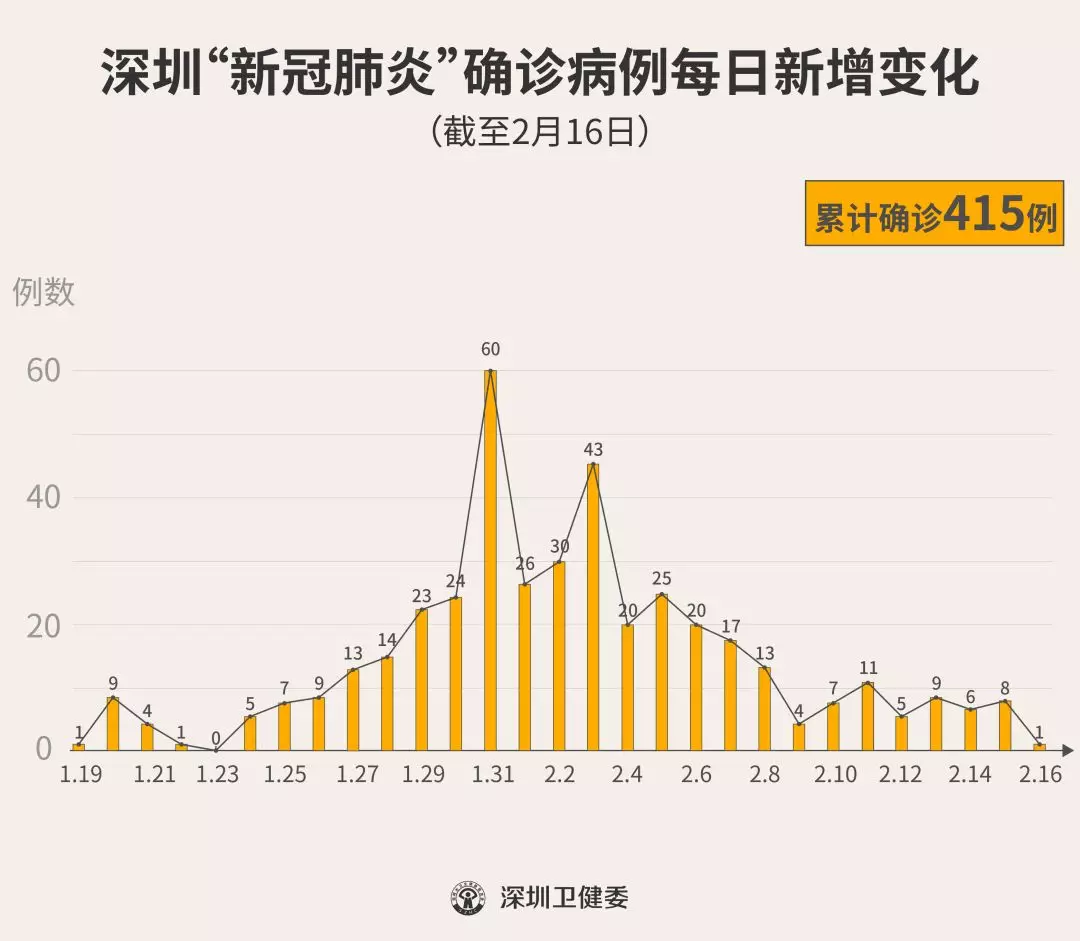 見(jiàn)圳客戶端·深圳新聞網(wǎng)2020年2月17日訊 據(jù)“深圳衛(wèi)健委”消息,截至2月16日24時(shí),深圳累計(jì)報(bào)告“新冠肺炎”確診病例415例。2月16日當(dāng)天全市新增確診病例1例,死亡2例。