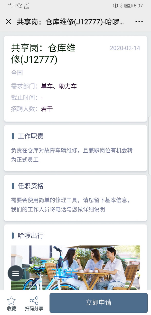 據(jù)了解,共享騎行的運(yùn)維工作有非常大的靈活性:一、根據(jù)崗位職能的不同,運(yùn)維每天的工作時(shí)間較靈活。如車輛調(diào)度人員,可以只在城市的上下班高峰期前后工作;二,工作形式上可以有比較大的靈活性。如哈啰的“單車獵人”,他的職能是在城市各個(gè)角落尋找因騎行超區(qū)失聯(lián)的單車、助力車;三,哈啰出行及哈啰的第三方人力公司,可以為這些崗位提供較為靈活的結(jié)薪方式,通過(guò)綠色通道可以做到按周或雙周結(jié)薪。待原崗用工恢復(fù),共享崗位員工可隨時(shí)返回。