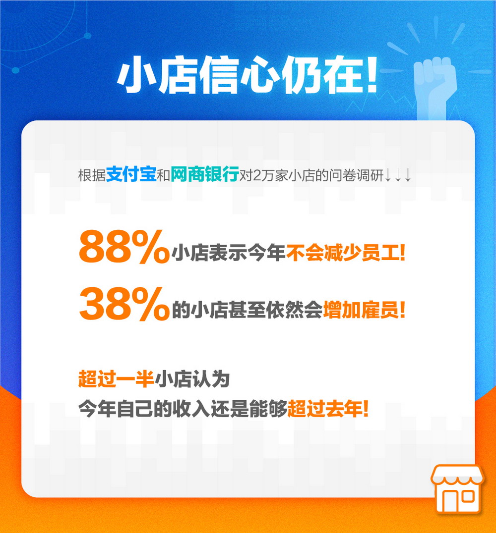 根據支付寶和網商銀行對20000家小店的問卷調研,88%小店表示,今年不會減少員工,38%的小店表示,依然會增加雇員;超過一半小店認為今年自己的收入還是能夠超過去年。