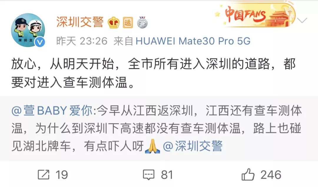 深圳交警表示,全市所有進入深圳的道路都要對進入的車輛查車測體溫。
