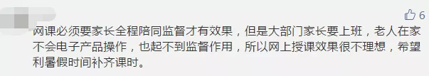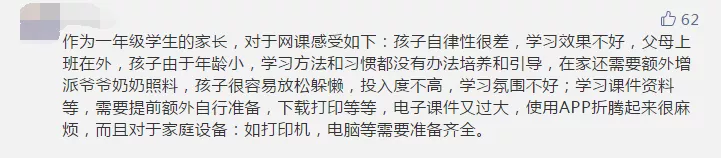 雖然網(wǎng)課兩端是老師和學生,但家長的參與也必不可少。部分參與者認為,如果沒有家長的有效監(jiān)管,網(wǎng)課很難保證教學質(zhì)量,而大部分家長已經(jīng)復工,無法時刻盯著孩子。有些家長晚上下班后還要監(jiān)督孩子上網(wǎng)課、做作業(yè),實在“費時、費力、費神”。讓孩子自己上網(wǎng)課,有些“連作業(yè)是什么都不清楚”。還有些孩子利用上網(wǎng)課的空檔玩游戲,甚至“從十七號開始到現(xiàn)在玩游戲超過1萬塊”。