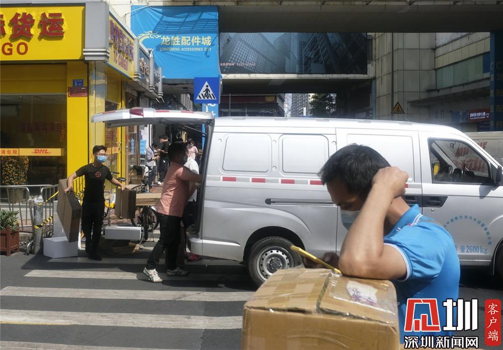 華強北龍勝配件城附近,搬運貨物的人均有佩戴口罩。