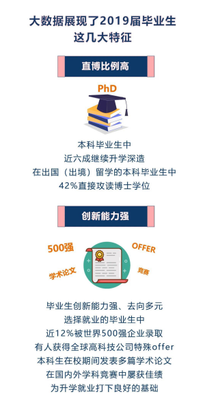 從本科畢業(yè)生升學(xué)情況來看,有超六成同學(xué)選擇了境外留學(xué),其中四成為直博。在2019屆畢業(yè)生里,直博人數(shù)為144人,占全體畢業(yè)生近20%。