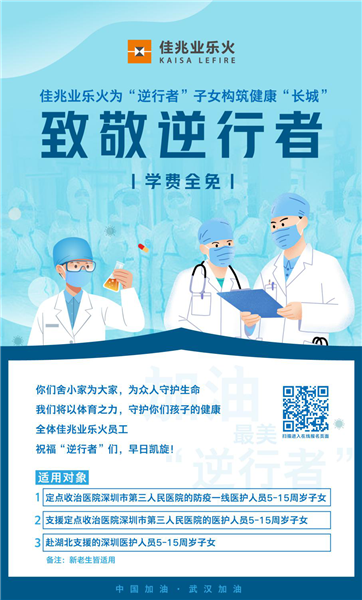 見(jiàn)圳客戶端·深圳新聞網(wǎng)2月29日訊(見(jiàn)圳客戶端、深圳新聞網(wǎng)記者  李云云  通訊員  張慧)突如其來(lái)的新冠肺炎疫情牽動(dòng)著人們的心,在這場(chǎng)沒(méi)有硝煙的戰(zhàn)斗中,廣大醫(yī)護(hù)人員舍小家為大家,日夜沖鋒守護(hù)在一線,成為這個(gè)特殊春節(jié)里最美的“逆行者”。日前,記者獲悉,佳兆業(yè)文體集團(tuán)旗下的佳兆業(yè)樂(lè)火國(guó)際文體學(xué)校將于3月1日到12月31日,為深圳定點(diǎn)收治醫(yī)院——深圳市第三人民醫(yī)院的防疫一線醫(yī)護(hù)人員以及赴鄂支援的深圳醫(yī)護(hù)人員子女提供免費(fèi)培訓(xùn)課程包,為“逆行者”子女構(gòu)筑健康“長(zhǎng)城”。