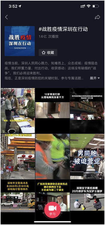 疫情防控期間,深圳市的政務(wù)頭條號(hào)和政務(wù)抖音號(hào)也“大放異彩”。以今日頭條和抖音兩個(gè)熱門平臺(tái)來看,抖音話題#戰(zhàn)勝疫情深圳在行動(dòng)#截至2月26日已累計(jì)1.6億次播放,參與視頻數(shù)262個(gè)。