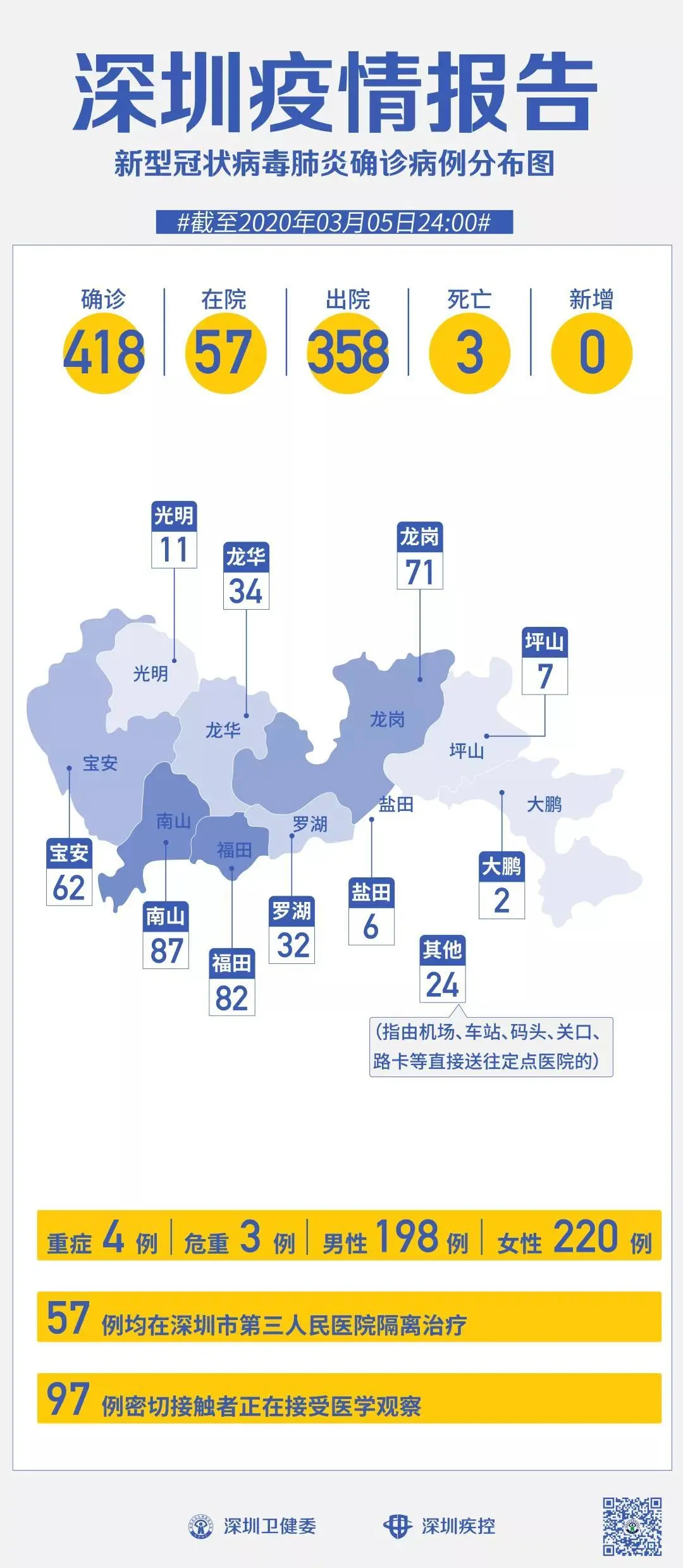 截至3月5日24時,深圳累計報告“新冠肺炎”確診病例418例。3月5日當天全市無新增確診病例,當天出院病例8例(從2月26日起不再公布出院個案)。 累計報告確診病例中,男性198例、女性220例。 按照病例管理地區(qū)劃分,南山區(qū)87例、福田區(qū)82例、龍崗區(qū)71例、寶安區(qū)62例、龍華區(qū)34例、羅湖區(qū)32例、光明區(qū)11例、坪山區(qū)7例、鹽田區(qū)6例、大鵬新區(qū)2例、其他(指由機場、車站、碼頭、關(guān)口、路卡等直接送往定點醫(yī)院的)24例。 目前,重癥4例、危重癥3例,死亡3例,累計出院358例。 57例確診病例均在深圳市第三人民醫(yī)院隔離治療。 97例密切接觸者正在接受醫(yī)學觀察。 資料來源:深圳市疾控中心、深圳市衛(wèi)健委、廣東省衛(wèi)健委
