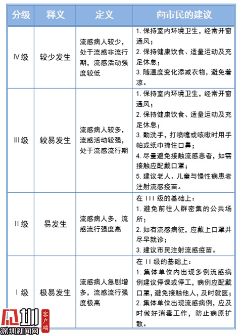 根據(jù)深圳市疾控中心發(fā)布的流感指數(shù)應(yīng)對指引,市民應(yīng)保持室內(nèi)環(huán)境衛(wèi)生,經(jīng)常開窗通風(fēng);保持健康飲食、適量運(yùn)動(dòng)及充足休息;勤洗手,打噴嚏或咳嗽時(shí)用手帕或紙巾掩住口鼻;盡量避免接觸流感患者,如需接觸應(yīng)配戴口罩;建議老人、兒童與慢性病患者注射流感疫苗。
