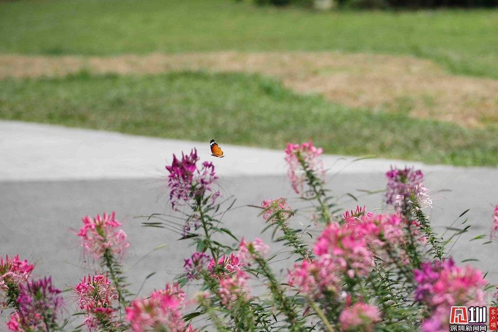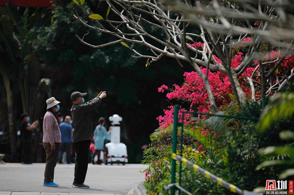 蓮花山公園一角,鮮花盛開,一位家長(zhǎng)正為她的孩子拍照。