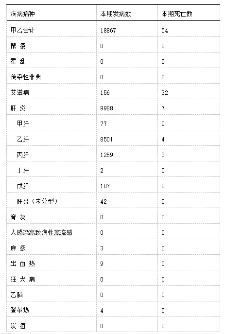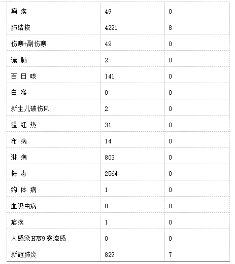 其中,甲類傳染病無報告,乙類傳染病甲類管理的新冠肺炎報告病例829例。乙類除傳染性非典型肺炎、脊髓灰質(zhì)炎、人感染高致病性禽流感、狂犬病、炭疽、乙腦、白喉、血吸蟲病、人感染H7N9禽流感無發(fā)病、死亡報告外,其余18種傳染病均有病例報告。