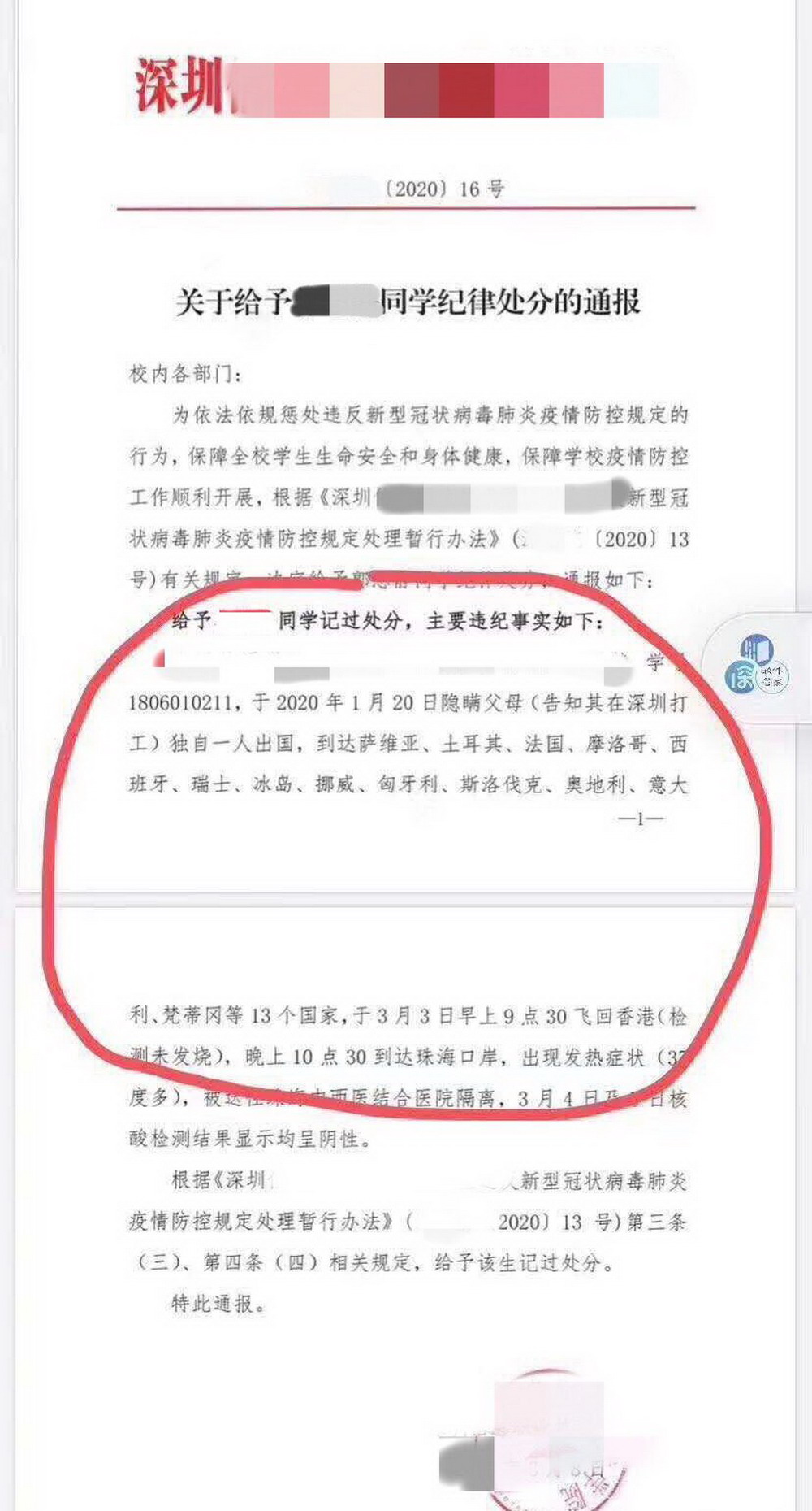 3月3日,小Y從珠海入境回國,在過海關(guān)時出現(xiàn)發(fā)燒癥狀并送往珠海中西醫(yī)結(jié)合醫(yī)院進(jìn)行隔離檢測?!霸谶^關(guān)的時候需要填寫旅行史,我如實填寫了,因為曾經(jīng)到過意大利等國家所以海關(guān)會重點監(jiān)測我。因為自身免疫力低,以及倒時差的原因,有些感冒低燒,但我也沒有隱瞞什么,如實闡述了我的行程和身體狀況,也很配合海關(guān)人員的調(diào)查。”3月4日、5日,當(dāng)事人核酸檢測結(jié)果均為陰性,由于違反定瞞報行程,小Y被學(xué)校予以記過處分。對于學(xué)校的處分決定,她坦言接受?!拔覜]有如實向?qū)W校匯報我的行程,我接受學(xué)校對我的處分?!?/p>