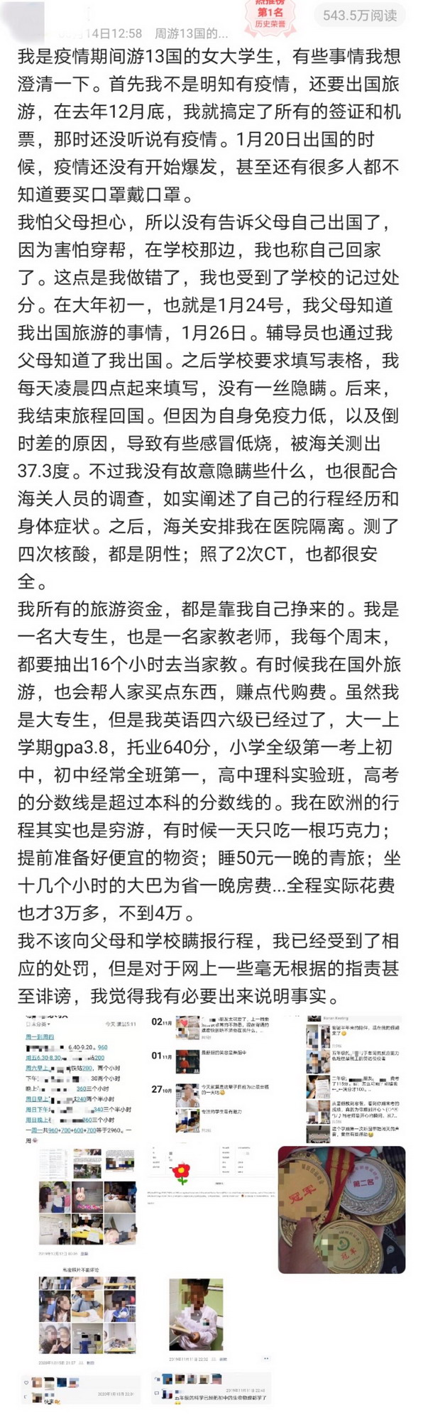 記者從小Y處了解到,1月20日,她出發(fā)開始旅行并于3月3日從珠海入境回國,期間共游玩13個國家?!?0月份就已經(jīng)決定出去玩,11月一直在準(zhǔn)備簽證,12月中旬簽證什么的都已經(jīng)準(zhǔn)備好了?!庇捎诤ε赂改笓?dān)心她一人在外旅行的安全問題,出發(fā)時并沒有告知父母?!?月23日,學(xué)校要求所有學(xué)生填寫一個假期所在地,我填寫的是‘在家’,因為不想讓家里人知道我在國外,害怕穿幫。出發(fā)時國內(nèi)疫情還沒有爆發(fā),所以不是很清楚國內(nèi)的疫情,也沒想到填這個信息是為了防控疫情所用,所以沒有如實填寫。大年初一,也就是1月24日,我父母知道了我出國的事,對我嚴(yán)厲批評。之后學(xué)校要求填寫表格,我沒有隱瞞,都是如實填寫?!?/p>