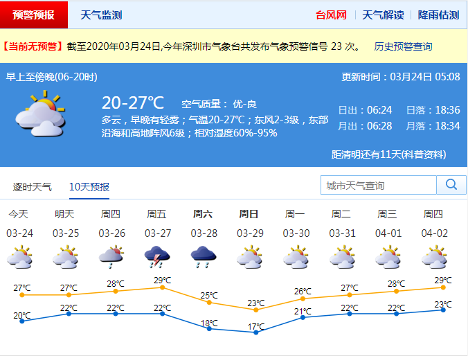 見圳客戶端·深圳新聞網(wǎng)2020年3月23日訊 深圳今天多云,早晚有輕霧;氣溫20-27℃;東風(fēng)2-3級(jí),東部沿海和高地陣風(fēng)6級(jí);相對(duì)濕度60%-95%。