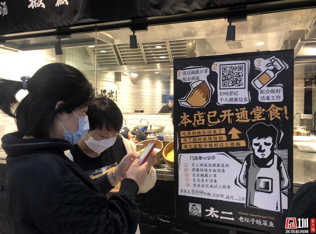 在太二酸菜魚門口,多位市民正按照員工要求,排隊掃碼登記個人健康信息。太二酸菜魚工作人員表示,門店嚴格按照要求,做好員工和消費者體溫檢測、健康監(jiān)控和佩戴口罩洗手消毒等防疫防控工作。