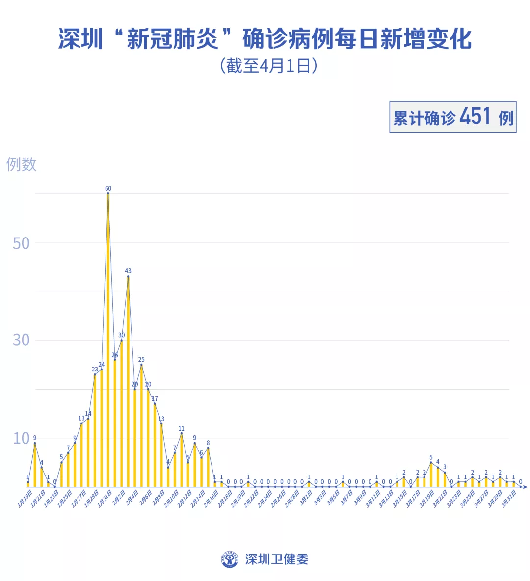 截至4月1日24時,深圳累計報告新冠肺炎病例451例。4月1日當(dāng)天新增無癥狀感染者2例,出院2例。