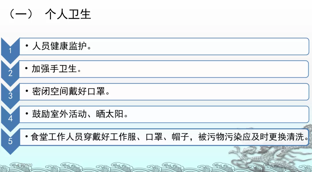 五是做好教育培訓(xùn)工作。學(xué)校要開展多種形式的健康宣教,普及新冠肺炎防控知識(shí),組織師生學(xué)習(xí)教育部和市教育局下發(fā)的各類指南和防疫知識(shí)。