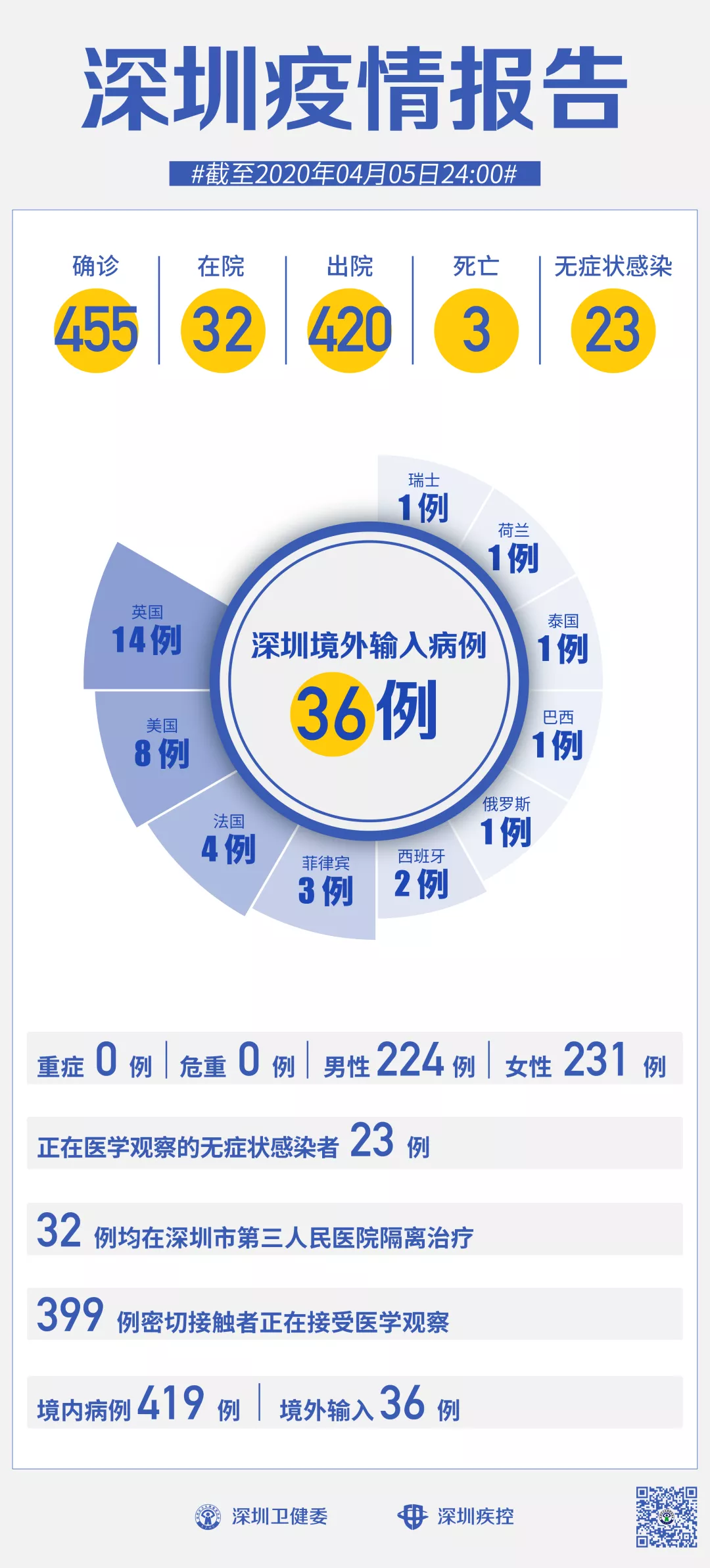 截至4月5日24時(shí),深圳累計(jì)報(bào)告新冠肺炎病例455例。4月5日當(dāng)天新增境內(nèi)病例1例,新增無癥狀感染者2例,出院1例。