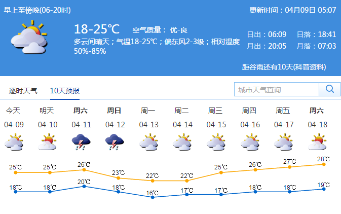 9-10日多云間晴天,氣溫回升;11日午后轉雷雨天氣,并伴有短時大風;12-13日冷空氣影響,氣溫下降3-4℃;展望14-16日多云天氣為主,氣溫逐日回升。