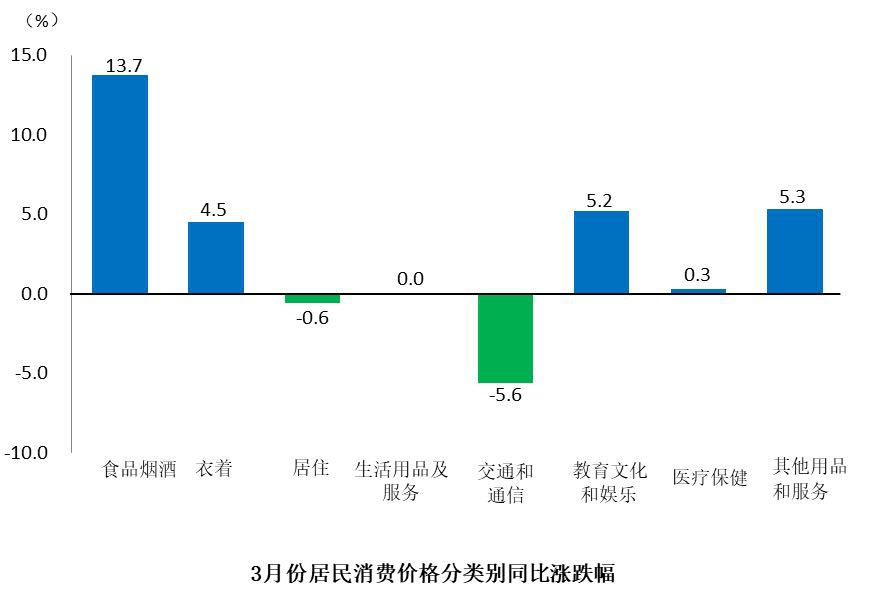 八大類商品和服務(wù)同比價(jià)格五升二降一平,食品煙酒價(jià)格上漲13.7%,其他用品和服務(wù)價(jià)格上漲5.3%,教育文化和娛樂價(jià)格上漲5.2%,衣著價(jià)格上漲4.5%,醫(yī)療保健價(jià)格上漲0.3%;交通和通信價(jià)格下降5.6%,居住價(jià)格下降0.6%;生活用品及服務(wù)價(jià)格持平。