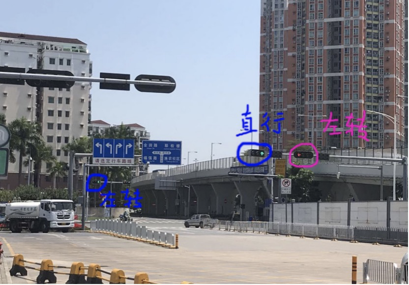13日中午,記者走訪該路口發(fā)現(xiàn),桂花路與三號(hào)路交叉口的信號(hào)燈設(shè)置確如市民描述的,與國(guó)花路口的紅綠燈設(shè)置不同,極易造成混亂。此處的左轉(zhuǎn)信號(hào)燈設(shè)在右側(cè),是因?yàn)楣鸹纷钣覀?cè)道路是保稅區(qū)車輛左轉(zhuǎn)通道;而直行信號(hào)燈設(shè)在左側(cè),則因?yàn)橹虚g三個(gè)車道均是直行車道。而國(guó)花路口的紅綠燈設(shè)置則是我們常見的左轉(zhuǎn)信號(hào)燈在左側(cè)。