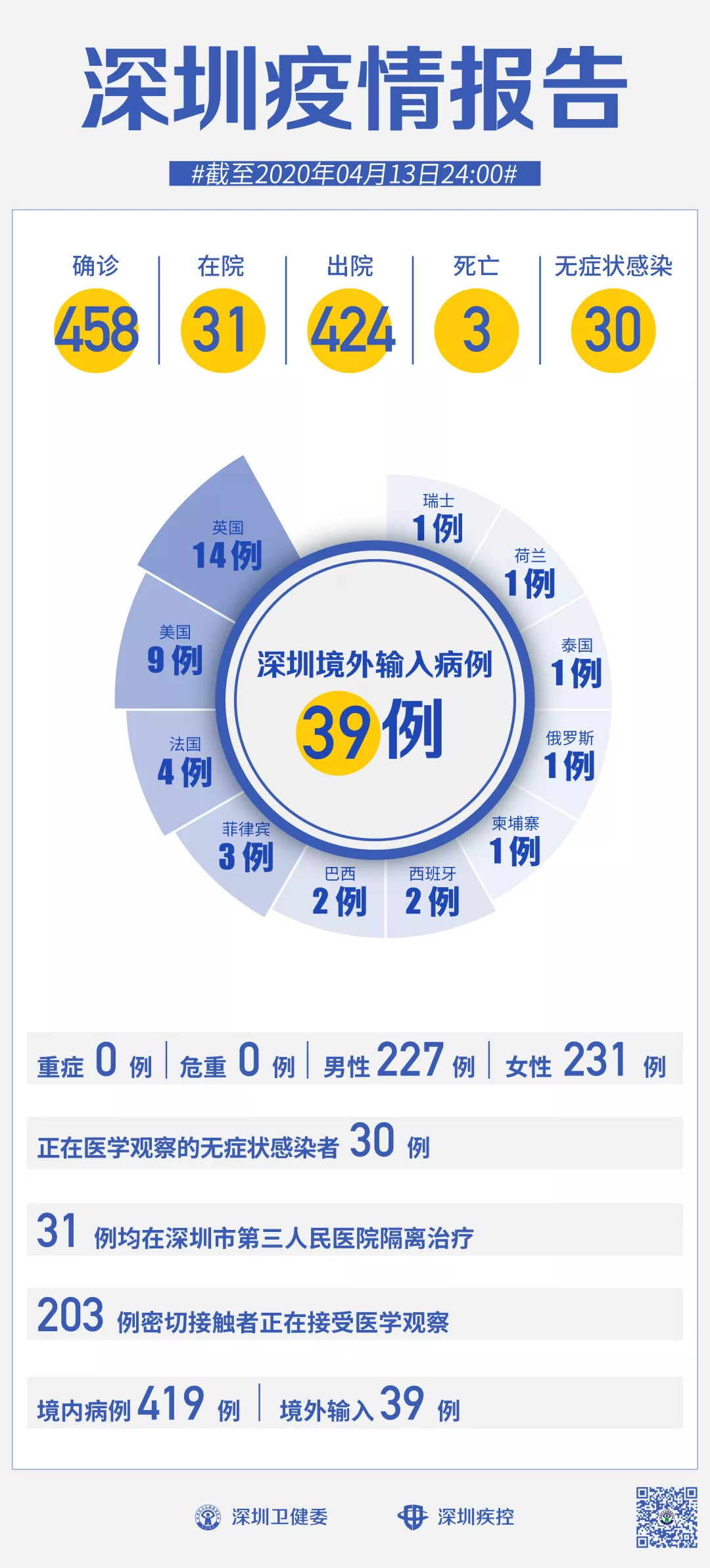 截至4月13日24時(shí),深圳累計(jì)報(bào)告新冠肺炎病例458例。4月13日當(dāng)天新增2例境外輸入病例,新增無癥狀感染者1例,出院1例。