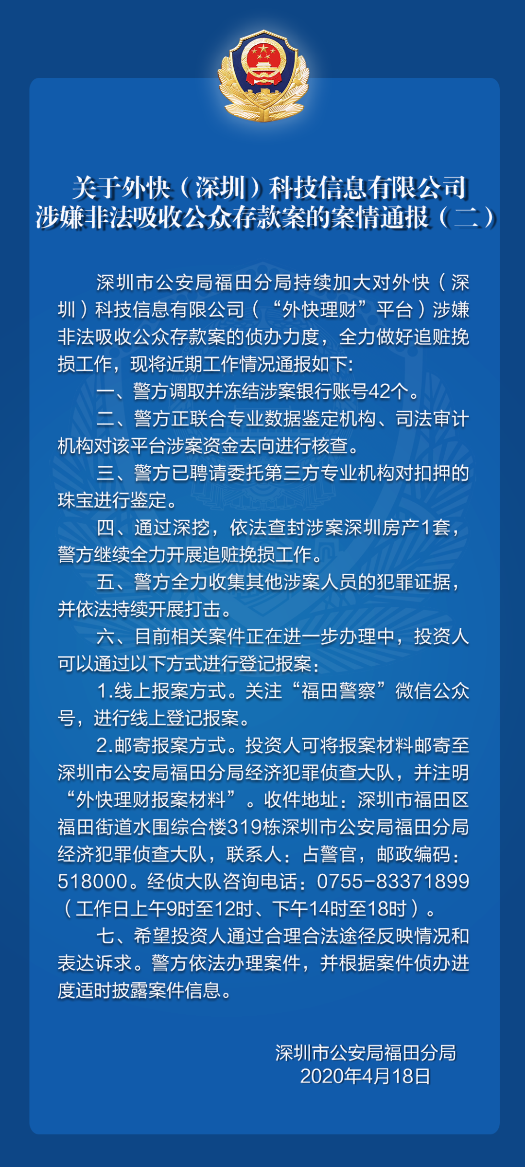 關于外快(深圳)科技信息有限公司涉嫌非法吸收公眾存款案的案情通報(二)