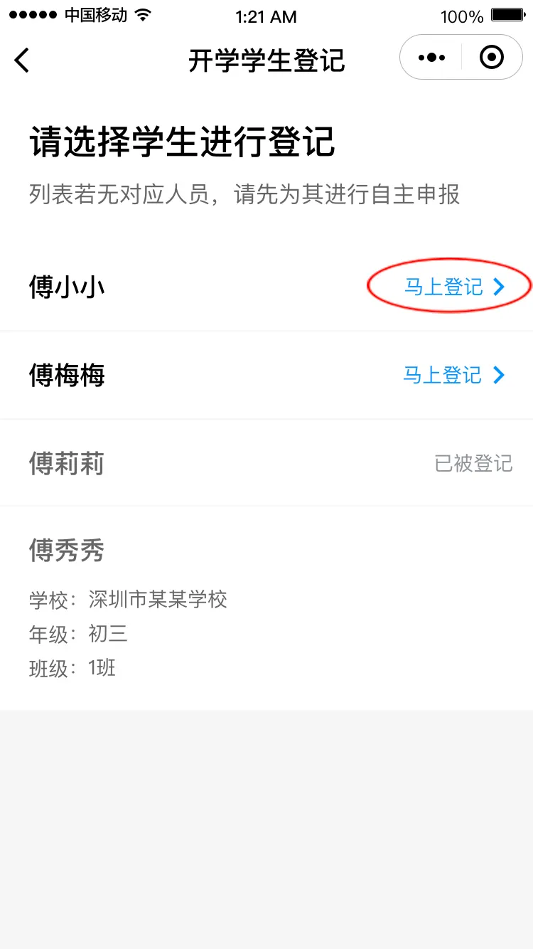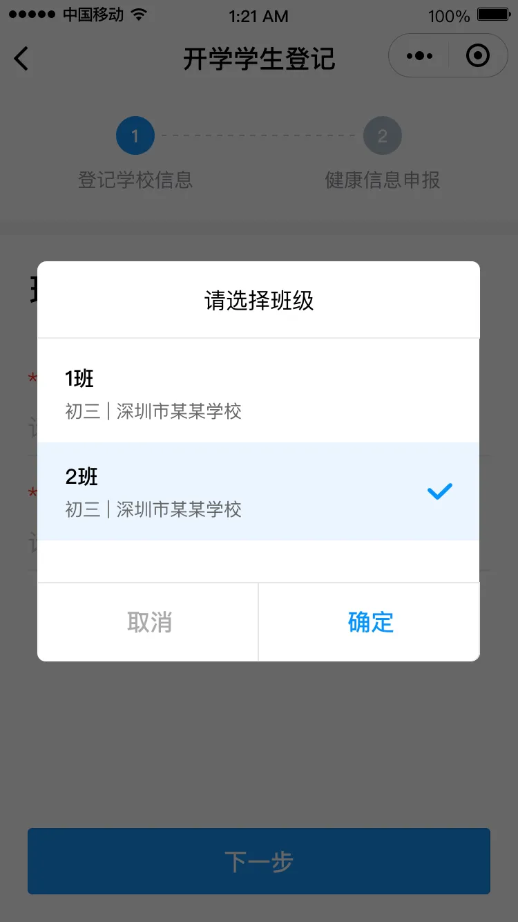 進(jìn)入“開學(xué)學(xué)生登記”頁面,點(diǎn)擊“馬上登記”進(jìn)入登記界面,填寫班主任姓名和手機(jī)號(hào)碼后點(diǎn)擊“下一步”,請(qǐng)選擇對(duì)應(yīng)的班級(jí),進(jìn)入健康申報(bào)卡界面。
