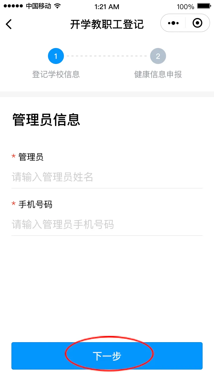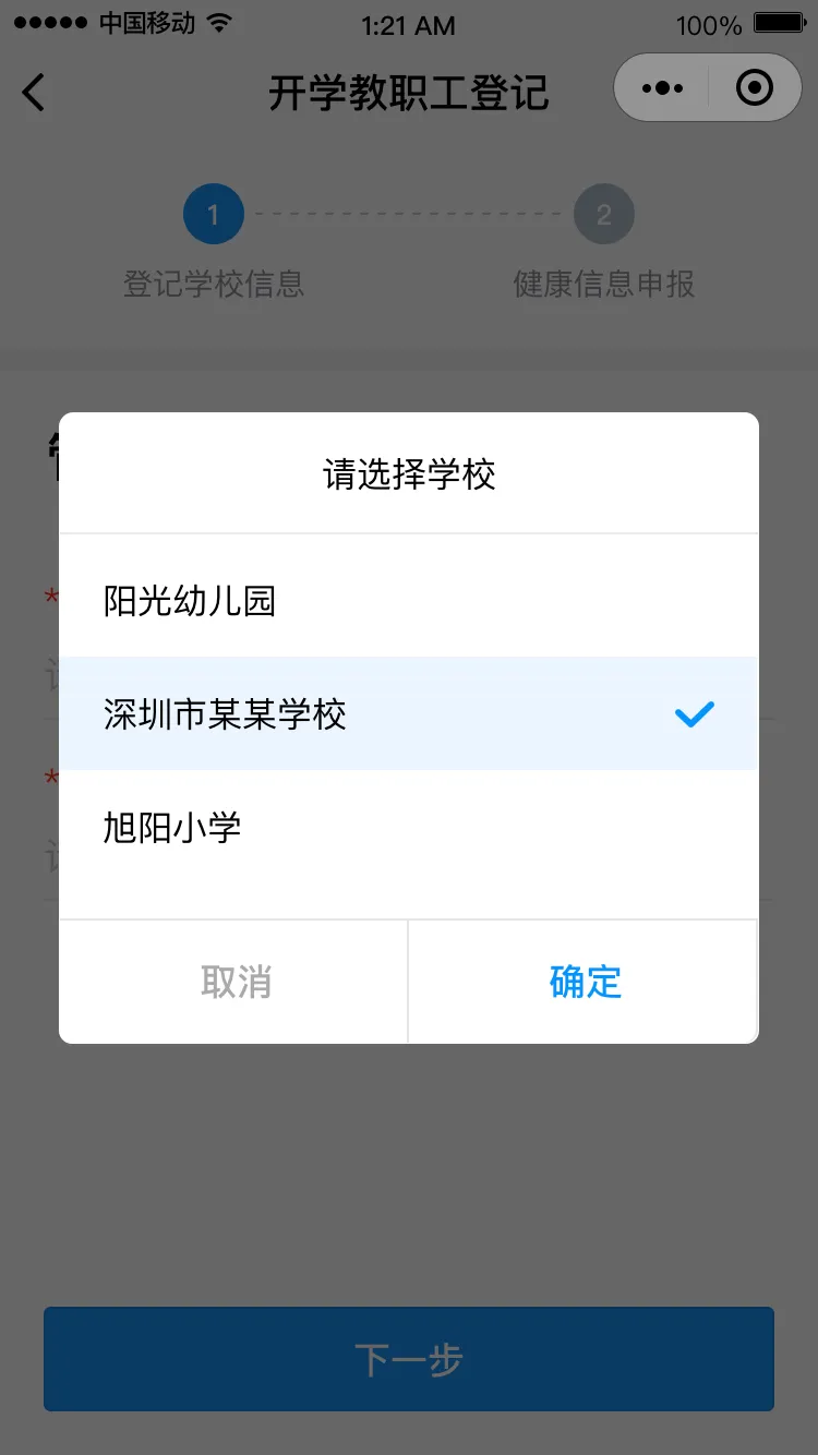 點(diǎn)擊“馬上登記”進(jìn)入登記界面,填寫學(xué)校管理員姓名和手機(jī)號(hào)碼(學(xué)校管理員姓名和手機(jī)號(hào)碼請(qǐng)?jiān)儐枌W(xué)校獲得),點(diǎn)擊“下一步”,請(qǐng)選擇對(duì)應(yīng)的學(xué)校,進(jìn)入健康申報(bào)卡界面。