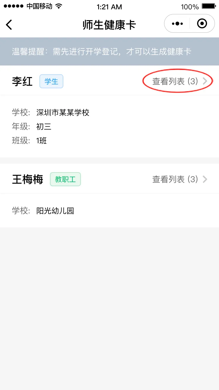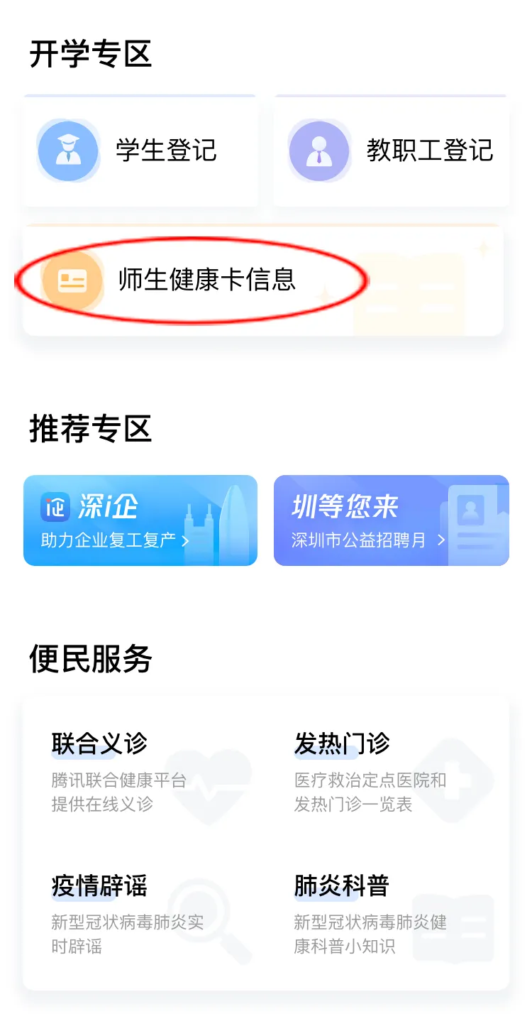 在開學(xué)專區(qū),點(diǎn)擊“師生健康卡信息”,進(jìn)入師生健康卡人員列表。