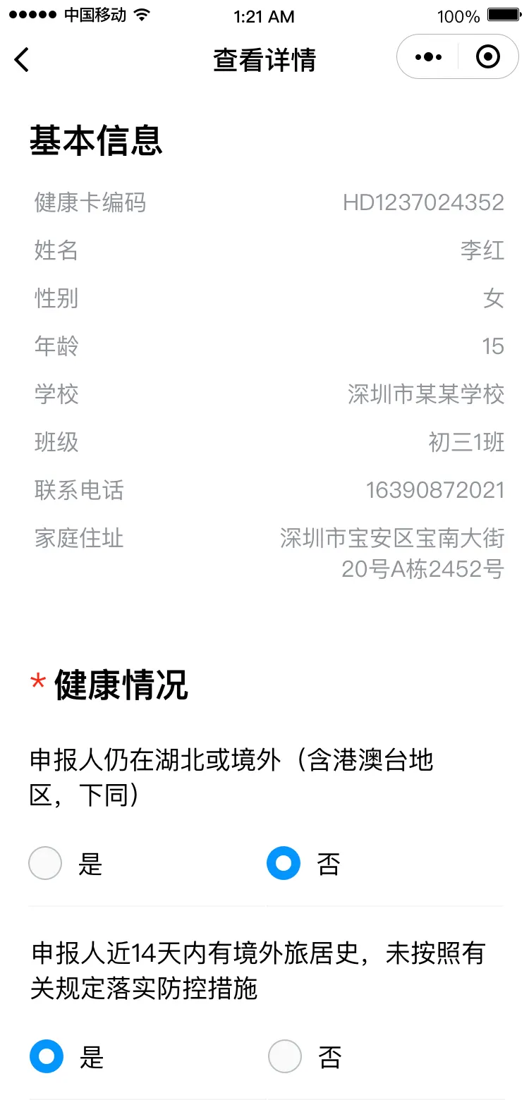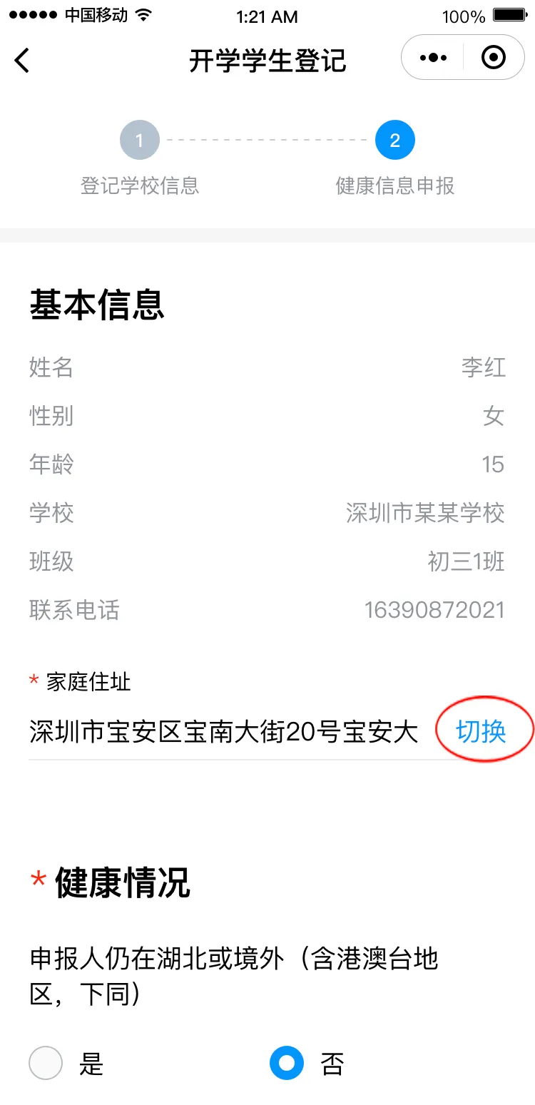 請(qǐng)根據(jù)實(shí)際情況完成健康信息申報(bào),包括選擇家庭住址、申報(bào)健康情況、填寫監(jiān)護(hù)人姓名。