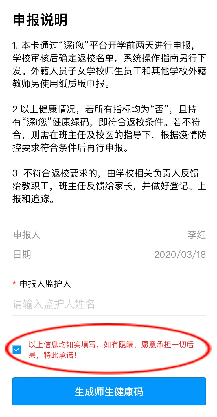 健康信息申報(bào)后,請(qǐng)勾選申報(bào)承諾,點(diǎn)擊“生成師生健康碼”即可完成健康申報(bào)。