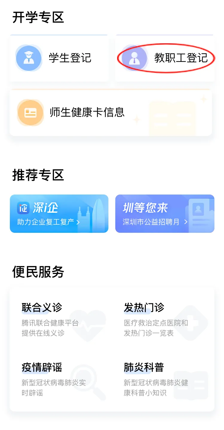 在開學(xué)專區(qū),點(diǎn)擊“教職工登記”進(jìn)行自主申報(bào)和實(shí)名認(rèn)證。