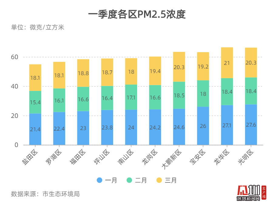 記者從深圳市生態(tài)環(huán)境局獲悉,2020年3月,全市74個街道PM2.5濃度在14.6-24.3微克/立方米之間,均值為19.0微克/立方米。
