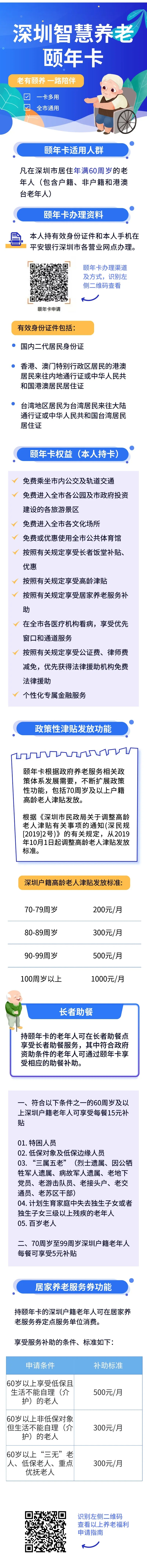 據(jù)悉,凡在深圳市居住年滿60周歲以上的老年人(包含港澳臺(tái)老年人),均可持有效身份證件和手機(jī)申請(qǐng)辦理。“頤年卡”持卡人,可享受敬老優(yōu)待,包括免費(fèi)進(jìn)入全市各公園,免費(fèi)進(jìn)入市政府投資建設(shè)各旅游景區(qū),免費(fèi)乘坐市內(nèi)公交車和軌道交通。70周歲及以上戶籍老人還可享受高齡津貼發(fā)放;符合規(guī)定的戶籍老年人可享受居家養(yǎng)老消費(fèi)的優(yōu)惠和補(bǔ)貼,包括:生活照料、家政服務(wù)、康復(fù)護(hù)理服務(wù)、日托服務(wù)、心理咨詢等。