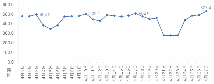 早晚高峰車流量逐日增加,高峰持續(xù)時(shí)間更長(zhǎng)深圳早晚高峰交通流量以“星期”為單位呈現(xiàn)逐日上升趨勢(shì),2月末全市車流量已恢復(fù)至正常工作日水平。3月末的497.6萬輛/天已超過去年同期的487.8萬輛/天。4月,全市車流量仍然呈上升趨勢(shì),4月27日的車流量已達(dá)527.4萬輛/天。車流量的不斷激增、早晚高峰集中出行,導(dǎo)致高峰持續(xù)時(shí)間較往年更長(zhǎng)。
