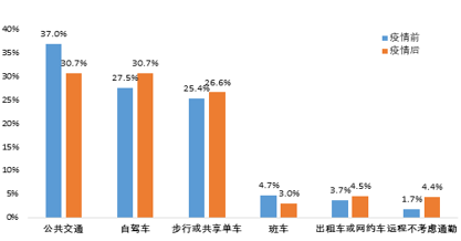 調(diào)查顯示,市民選擇公共交通方式的比例從疫情前的約37%下降至約30%,選擇私人小汽車的從27.5%上升至30.7%,選擇步行、自行車等慢行方式的從25.4%上升至接近27%。疫情過后,市民出行選擇公共交通的比例有所下降,小汽車和風(fēng)險更低,更私密、更獨(dú)立的慢行交通方式成為偏好選擇。