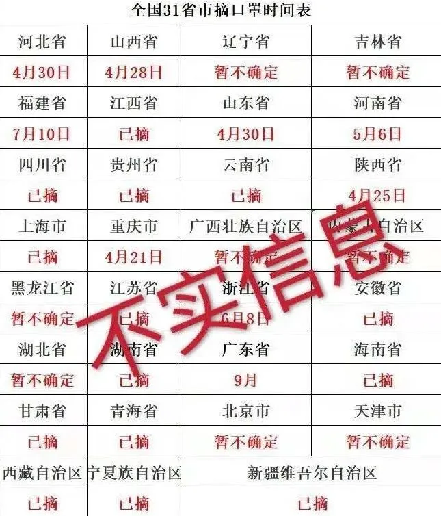 近日,一張網(wǎng)絡(luò)截圖在微信群流傳,截圖內(nèi)容中包含了全國(guó)各地摘口罩的時(shí)間。