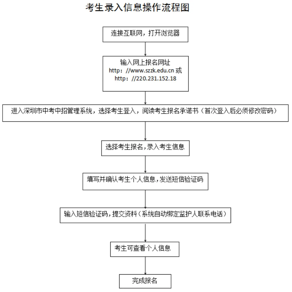 見圳客戶端·深圳新聞網(wǎng)2020年4月30日訊 據(jù)深圳市教育局消息,2020年深圳高中階段學(xué)校招生考試(以下簡(jiǎn)稱“中考”)報(bào)名定于5月6日-15日進(jìn)行,考試時(shí)間為7月20日-21日。 今年本市應(yīng)屆初中畢業(yè)生仍繼續(xù)在就讀學(xué)校集體辦理報(bào)名手續(xù)。符合深圳中考報(bào)名條件的深圳戶籍往屆生、在市外就讀的深圳戶籍應(yīng)屆初中畢業(yè)生(以下簡(jiǎn)稱“社會(huì)類考生”)采用網(wǎng)上報(bào)名方式進(jìn)行報(bào)名。 報(bào)名條件 一、具有我市戶籍的初中畢業(yè)生,可以在我市報(bào)名參加中考。 二、具有我市初三學(xué)籍的隨遷子女可以報(bào)名參加中考,同時(shí)符合以下條件的,可以參加相應(yīng)的公辦普高、民辦普高和中職學(xué)校的劃線錄取。 (一)父親或母親在我市具有合法穩(wěn)定職業(yè); (二)父親或母親在我市具有合法穩(wěn)定住所; (三)父親或母親持有有效《深圳經(jīng)濟(jì)特區(qū)居住證》; (四)父親或母親在我市繳納基本養(yǎng)老保險(xiǎn)及基本醫(yī)療保險(xiǎn),且至少其中一個(gè)險(xiǎn)種累計(jì)繳費(fèi)滿3年,社保累計(jì)年限計(jì)算截至2020年8月31日; (五)隨遷子女在我市具有3年完整初中學(xué)籍。 不符合上述條件但具有我市初中學(xué)籍的隨遷子女,可以在我市參加中考,但僅限于參加民辦普高補(bǔ)錄或中職學(xué)校注冊(cè)入學(xué)。 三、高中階段學(xué)校在校生不得報(bào)名。 本市應(yīng)屆初中畢業(yè)生報(bào)名辦法 本市應(yīng)屆初中畢業(yè)生于5月6日至7日在就讀學(xué)校集體辦理報(bào)名手續(xù)。 今年中考繼續(xù)實(shí)行網(wǎng)上報(bào)名。要求各學(xué)校開放計(jì)算機(jī)房,為本校考生上網(wǎng)報(bào)名提供方便。 5月8日至15日,學(xué)校組織考生進(jìn)行電子攝像,學(xué)校和考生分別上網(wǎng)錄入報(bào)名信息,考生錄入信息可參考“考生錄入信息流程圖”進(jìn)行操作。 市教育局強(qiáng)調(diào),學(xué)校不得以任何理由拒絕有本校學(xué)籍的應(yīng)屆畢業(yè)生報(bào)考(參加中職學(xué)校自主招生、注冊(cè)入學(xué)的考生,也須報(bào)名參加中考)。如有違反者,將嚴(yán)肅查處,并追究相關(guān)人員責(zé)任。同時(shí)要求各區(qū)有關(guān)職能部門、各有關(guān)學(xué)校(報(bào)名點(diǎn))要嚴(yán)格審查報(bào)名材料。對(duì)不符合報(bào)名條件、弄虛作假而被錄取的考生,一經(jīng)發(fā)現(xiàn),取消其錄取資格;已經(jīng)到錄取學(xué)校報(bào)到注冊(cè)的,取消其學(xué)籍,并追究相關(guān)人員責(zé)任。 社會(huì)類考生報(bào)名辦法 社會(huì)類考生采用網(wǎng)上報(bào)名方式進(jìn)行報(bào)名。報(bào)名考生需在5月6日至15日登錄報(bào)名網(wǎng)址(http://www.szzk.edu.cn/),按照提示進(jìn)行網(wǎng)上注冊(cè),上傳報(bào)名審核資料,由考生戶籍所在區(qū)社會(huì)報(bào)名點(diǎn)進(jìn)行線上審核,審核通過后系統(tǒng)將生成中考考生號(hào)及初始密碼,考生需用獲取的考號(hào)及密碼登錄中考中招管理系統(tǒng),填寫個(gè)人信息,具體操作可參考“考生錄入信息流程圖”。同時(shí)需在報(bào)名截止前根據(jù)指引完成網(wǎng)上繳費(fèi)。 若考生網(wǎng)上報(bào)名審核不通過,需按照系統(tǒng)的不通過原因提示,重新補(bǔ)充審核資料,如多次上傳資料失敗或?qū)徍瞬煌ㄟ^,考生可撥打戶籍所在區(qū)的社會(huì)報(bào)名點(diǎn)電話進(jìn)行咨詢或電話預(yù)約,按照工作人員指示進(jìn)行操作報(bào)名,不要在未預(yù)約的情況下前往社會(huì)報(bào)名點(diǎn),盡量避免出行,減少人員聚集。 社會(huì)類考生操作流程如下圖: 考生錄入信息操作流程如下圖: 中考社會(huì)報(bào)名點(diǎn)一覽表 深圳各類考生具體報(bào)考范圍、各類升學(xué)資格申報(bào)所需條件和材料以及相關(guān)報(bào)名要求,考生可通過深圳市招生考試辦公室官網(wǎng)(zkb.sz.gov.cn)及官方微信公眾號(hào)(深圳市招生考試辦公室)查閱,市招考辦也將第一時(shí)間通過上述渠道發(fā)布各類中考資訊。
